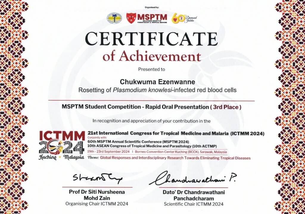 熱帯医学・グローバルヘルス研究科博士前期課程グローバルヘルス専攻ヘルスイノベーションコースを令和69月に修了したEZENWANNE, Chukwuma Stephenさんの発表が、2024919日~923日にかけてマレーシアで開催された「第21回国際熱帯医学・マラリア会議(ICTMM2024)」で、「MSPTM Student Competition – Rapid Oral Presentation Award」第3席を受賞しました。本賞は、研究の独創性やアイデア、方法論の質、プレゼンテーションスキル、質問への応対などが審査されるもので、Competitionへの応募者から選ばれた38演題を対象としたものです。受賞対象となった題目は、「Rosetting of Plasmodium knowlesi-infected red blood cells」で、EZENWANNEさんが、金子修教授、坂口美亜子助教、成瀬妙子助教の指導の下、精力的に研究を行い、その成果を発表したものです。