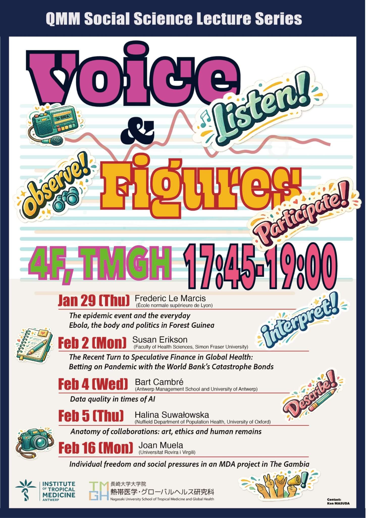 長崎大学熱帯医学・グローバルヘルス研究科で開催されるアントワープ熱帯医学研究所のQMM(国際保健研究における質的・混合手法)プログラム(2026年1月26日~2月20日)と連携し、QMM Social Science Lecture Series “Voice and Figures”が開催されます。この連続講演では、QMMプログラム参加のため来日する客員講師を招き、グローバルヘルス分野における質的研究および混合手法の応用事例を発表していただきます。